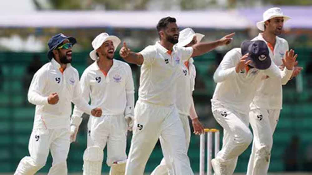 जम्मू-कश्मीर ने तेज गेंदबाज औकिब नबी की धारदार गेंदबाजी से कर्नाटक के शीर्ष क्रम को ध्वस्त करते हुए बृहस्पतिवार को यहां तीसरे दिन मयंक अग्रवाल के नाबाद शतक के बावजूद पहली पारी में मेजबान टीम का स्कोर पांच विकेट पर 220 रन करके अपना पलड़ा भारी रखा। दिन का खेल खत्म होने पर अग्रवाल 130 रन बनाकर खेल रहे थे जबकि विकेटकीपर कृतिक कृष्णा 27 रन बनाकर उनका साथ निभा रहे हैं। कर्नाटक की टीम अब भी पहली पारी के आधार पर मेहमान टीम से 364 रन पीछे है। नबी ने जम्मू-कश्मीर के लिए शानदार प्रदर्शन करते हुए 14 ओवर में 32 रन देकर तीन विकेट चटकाए। जम्मू-कश्मीर ने इससे पहले शुभम पुंडीर के 121 रन की मदद से अपने पहले रणजी फाइनल में पहली पारी में 584 रन का बड़ा स्कोर बनाया। क्वार्टर फाइनल में मध्य प्रदेश के खिलाफ 12 विकेट चटकाने वाले 28 साल के नबी ने पूरे सत्र में टीम के लिए शानदार प्रदर्शन किया और मौजूदा सत्र में उनके विकेटों की संख्या 58 हो गई है जो उत्तराखंड के स्पिनर मयंक मिश्रा के 59 विकेट से सिर्फ एक कम है