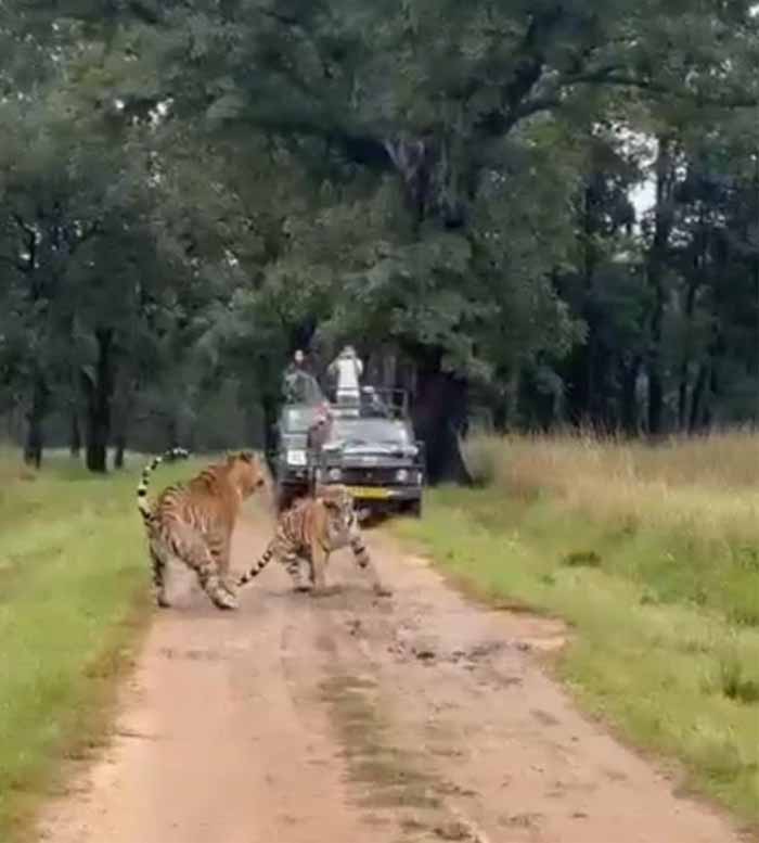 बाघ, बाघिन को रिझाने का प्रयास करता है, लेकिन बाघिन अचानक दहाड़ मारकर अपना रौद्र रूप दिखाती है। तभी बाघ-बाघिन एक ही समय पर कुछ ही सेकंड के लिए दोनों पांव पर खड़े हो जाते हैं। दूसरे वाहन में बैठे पर्यटकों ने इस पल को अपने कैमरे में कैद कर लिया। 29 सेकंड के इस वीडियो को देखकर हर कोई रोमांचित हो रहा है।